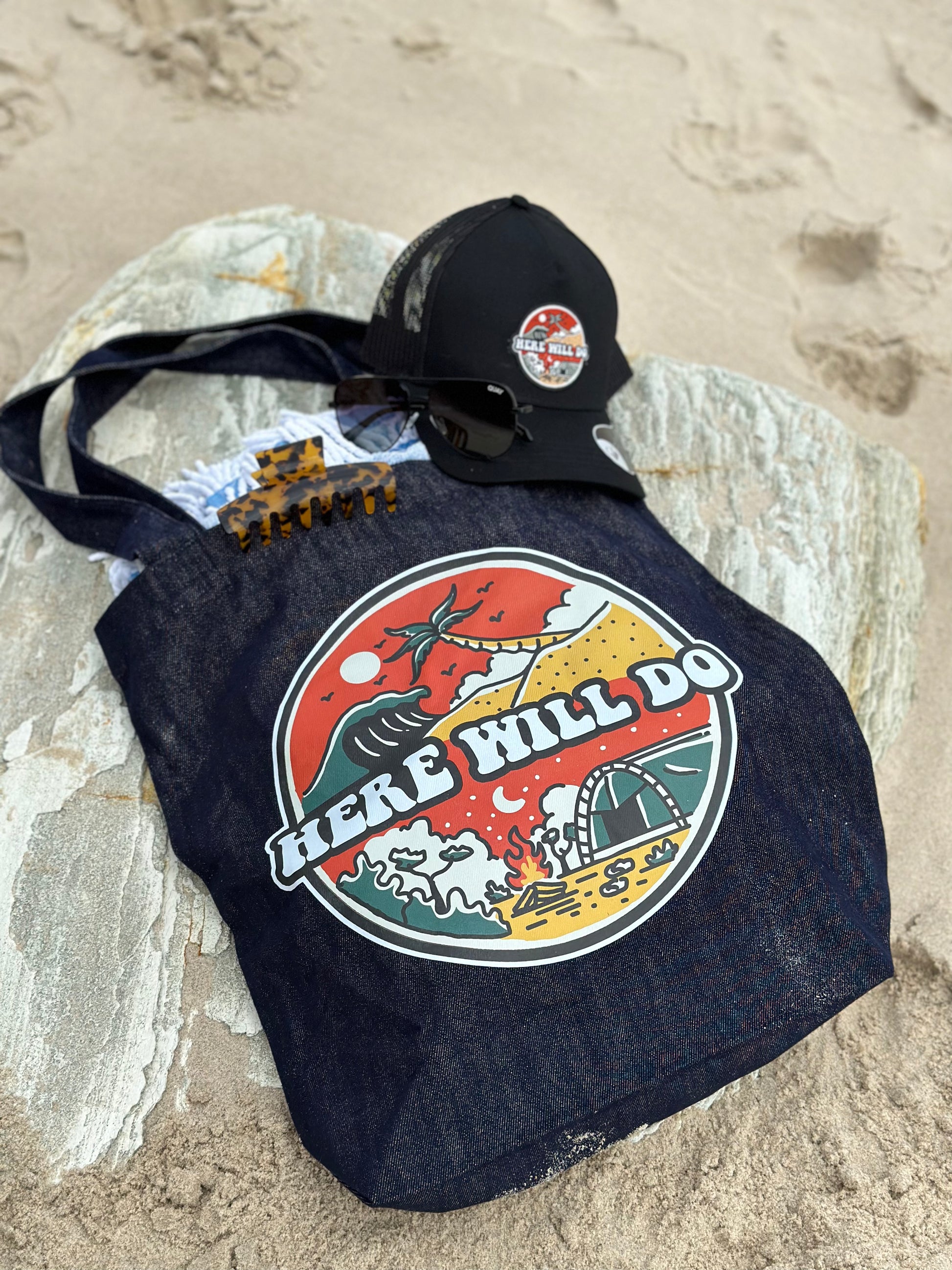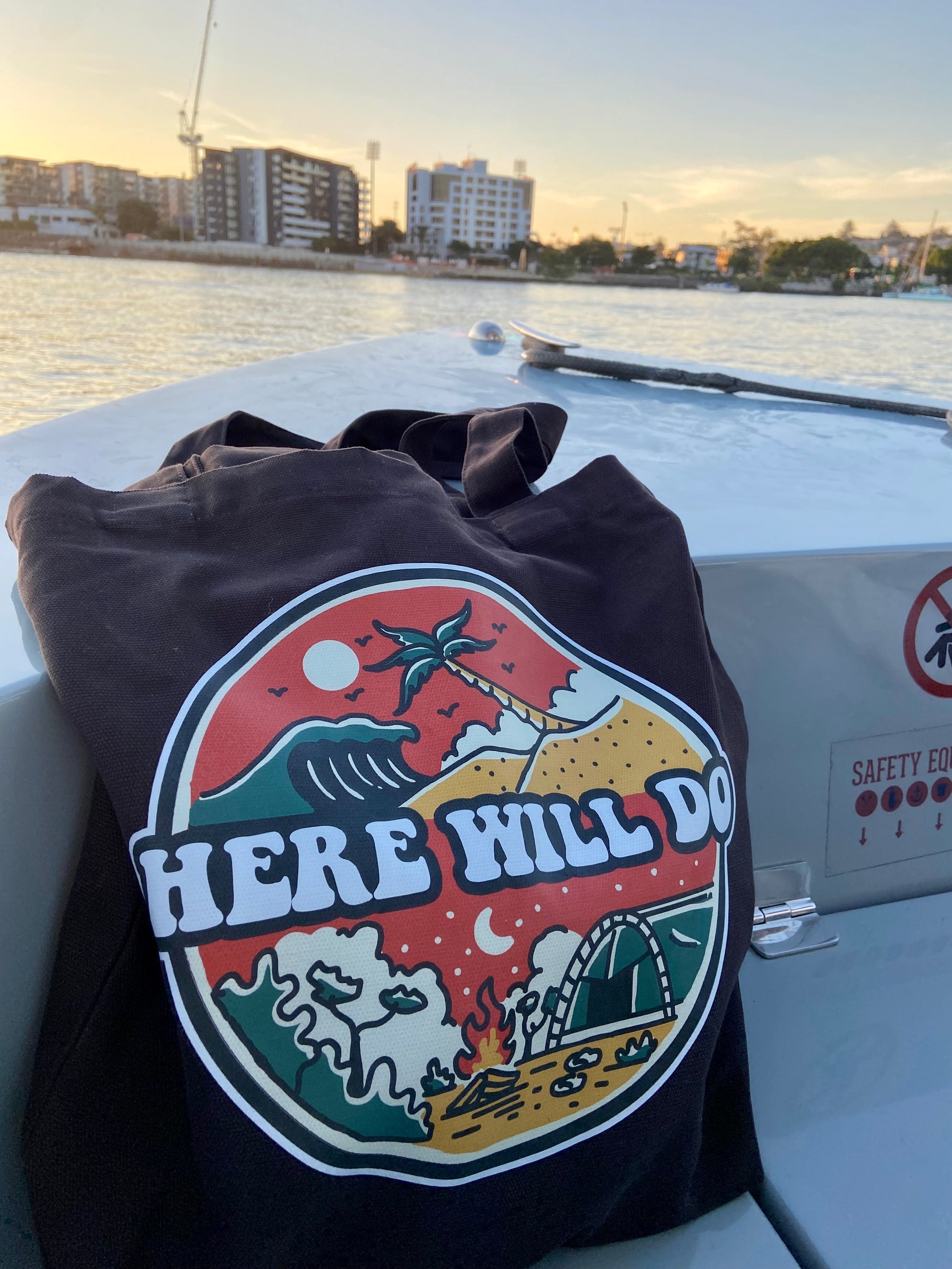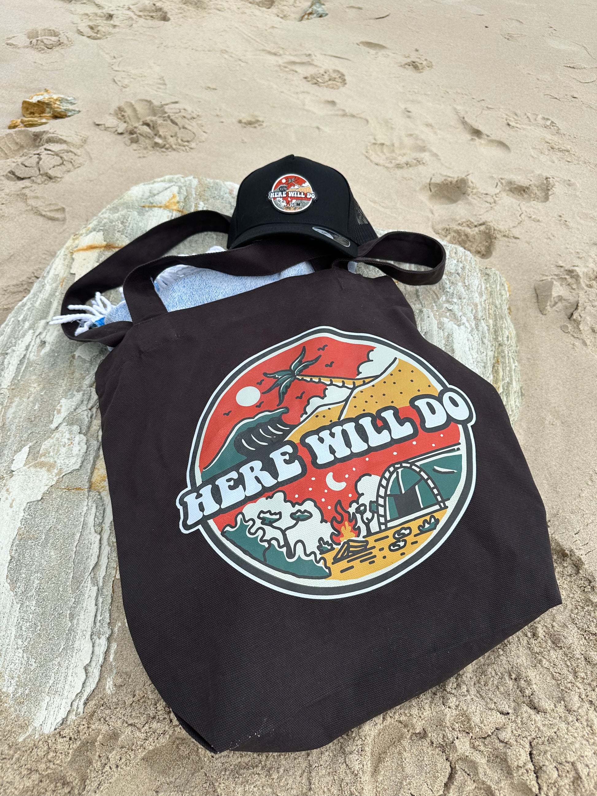 100% Cotton canvas tote bags with reinforced shoulder straps and Here Will Do Logo. 2 sizes / colours available.
